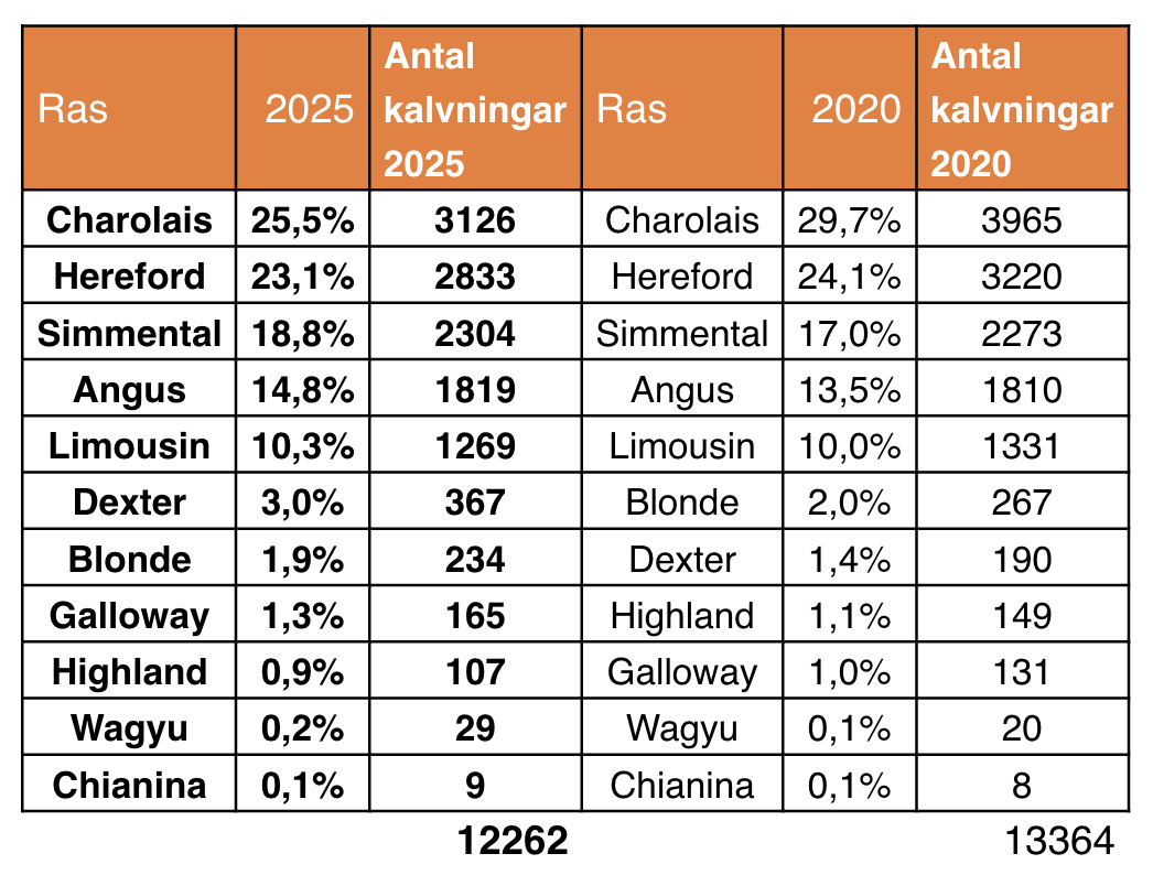 Andel kalvningar för Charolais har på 5 år minskat från 29,7 % till 25,5 % vilket får anses vara en stor minskning. Även Hereford har minskat något (24,1% till 23,1%). De raser där andelen ökat är Simmental (17.0 % till 18,8 %), Angus (13,5 % till 14,8 %), Limousin (10% till 10,3%) , Dexter (2% till 3%), Blonde (1,4 % till 1,9 %).