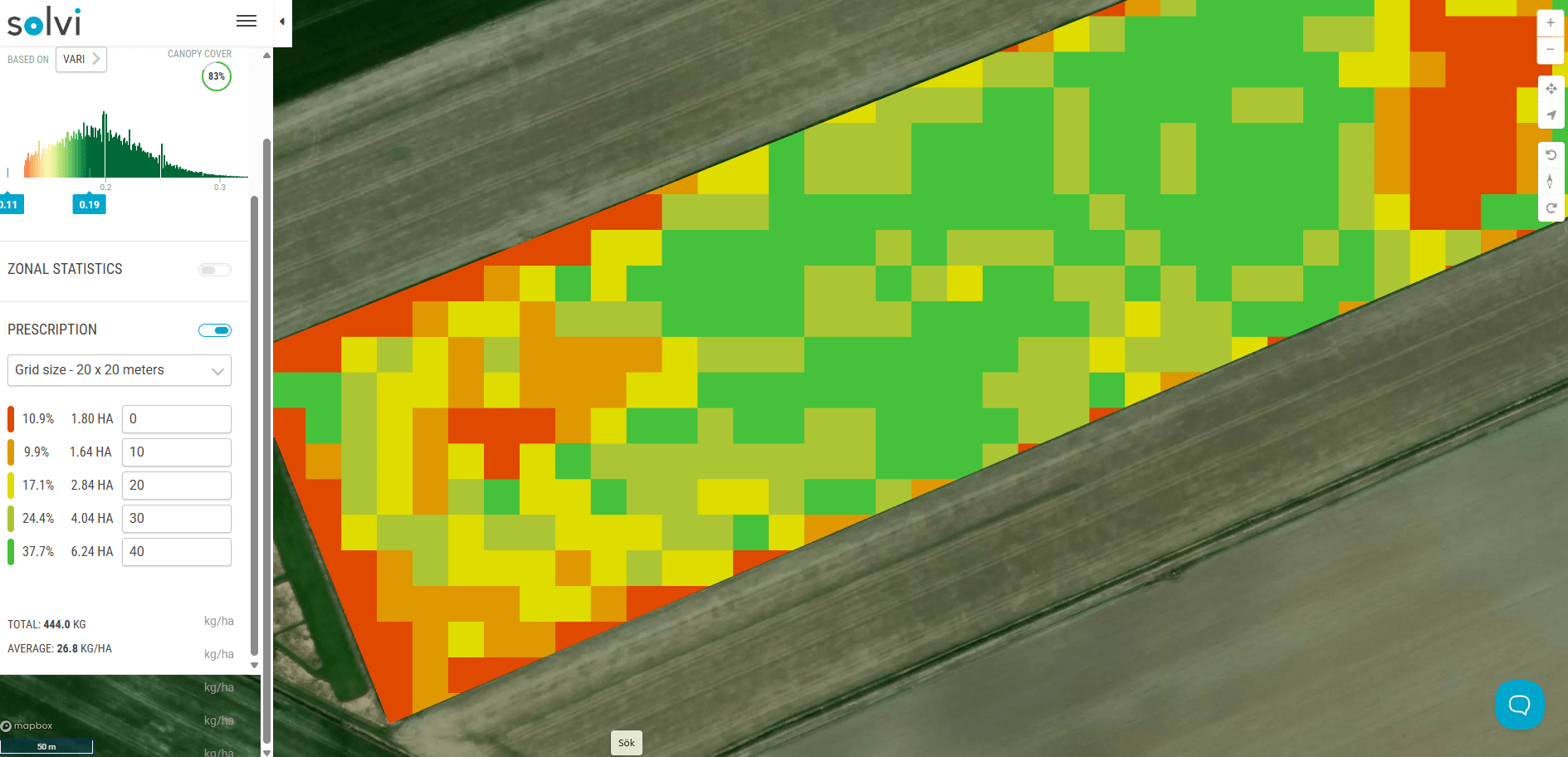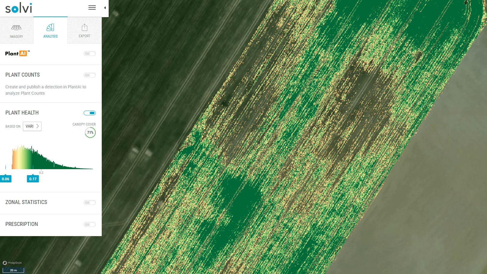 Analys av grödhälsa i programvaran Solvi som visar en grönytetäckning på 71%.