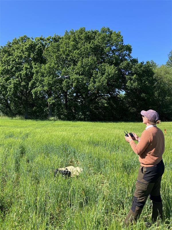 Praktikant David testar på att köra drönaren DJI mini ute i fält.